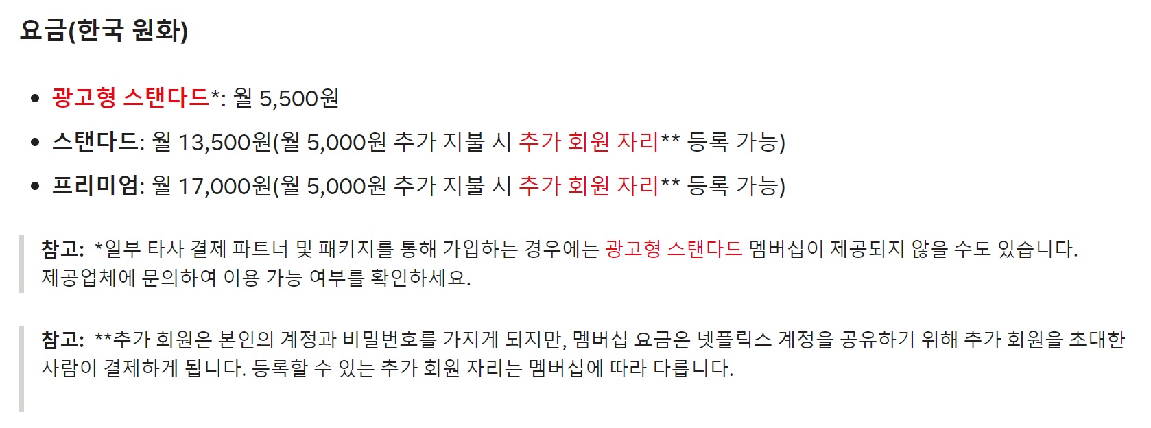 "넷플릭스에서 지속적으로 더 많은 TV 프로그램과 영화를 추가하고 새로운 제품 기능을 도입하기 위해 넷플릭스 멤버십 및 요금이 변경될 수 있습니다. 또한 현지 세금변경, 인플레이션 등 현지 시장 내 변화에 대응하기 위해 멤버십 및 요금 변경이 이루어질 수도 있습니다.